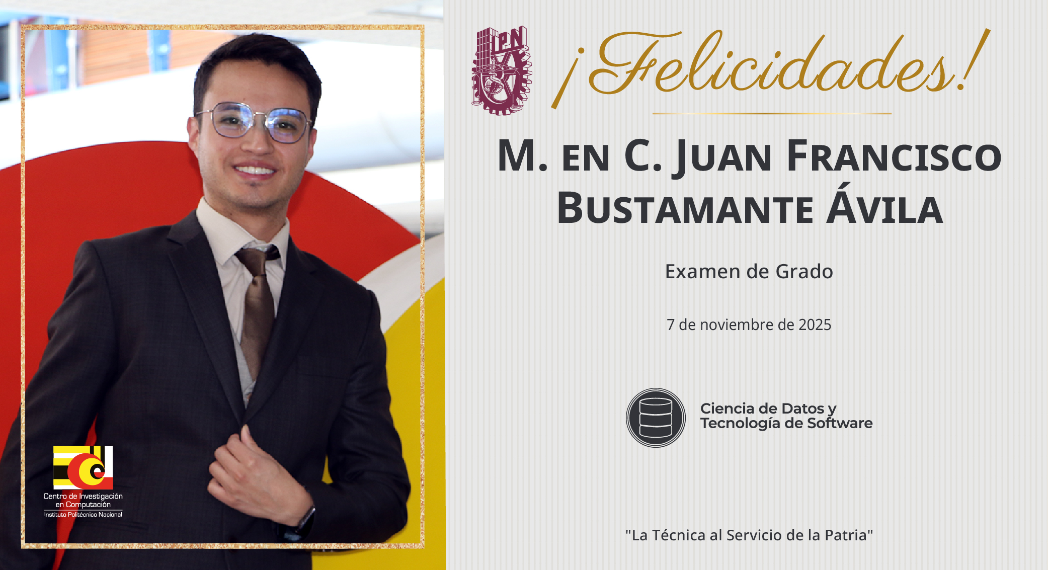 El Centro de Investigación en Computación felicita al M. en C. Juan Francisco Bustamante Ávila egresado de la Maestría en Ciencias de la Computación del laboratorio de Ciencia de Datos y Tecnología de Software.
