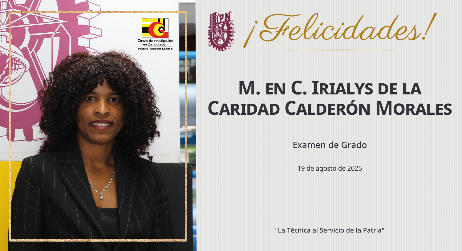 El Centro de Investigación en Computación felicita a la M. en C. Irialys de la Caridad Calderón Morales egresada de la Maestría en Ciencias en Ingeniería de Cómputo del laboratorio de Robótica y Mecatrónica.