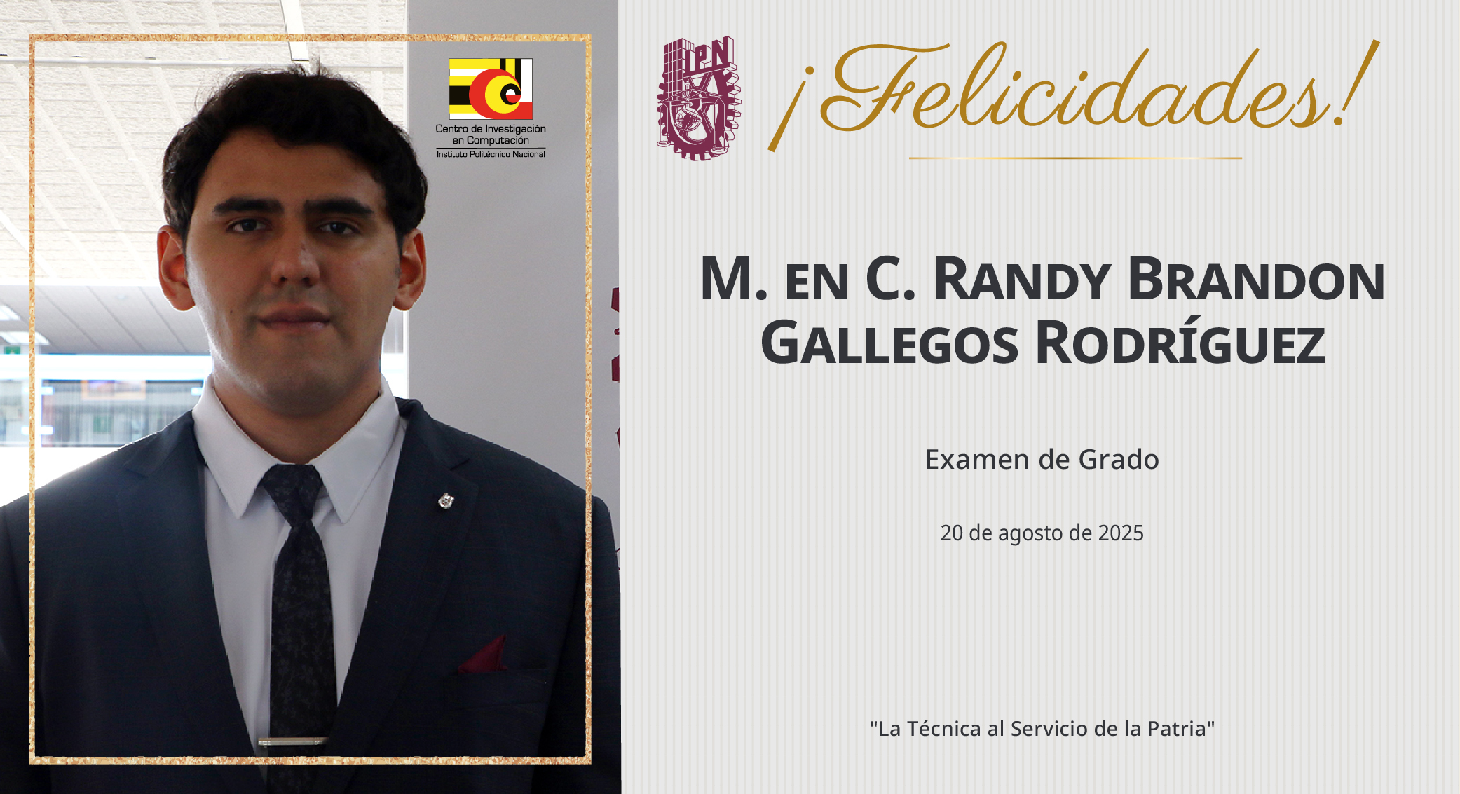 El Centro de Investigación en Computación felicita al M. en C. Randy Brandon Gallegos Rodríguez egresado de la Maestría en Ciencias de la Computación del laboratorio de Procesamiento de Información Geoespacial.