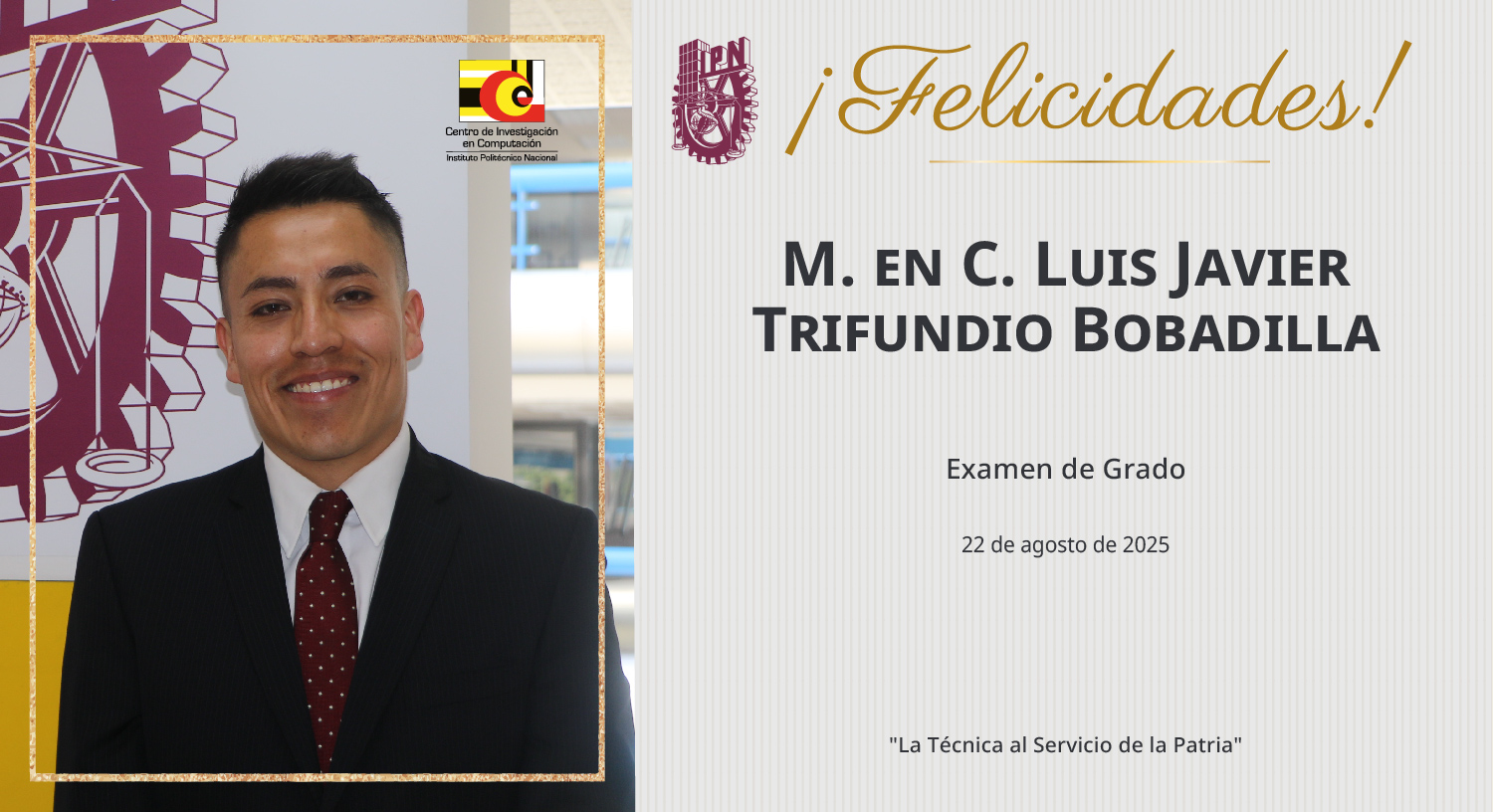 El Centro de Investigación en Computación felicita al M. en C. Luis Javier Trifundio Bobadilla, egresado de la Maestría en Ciencias de la Computación del laboratorio de Ciencias Cognitivas Computacionales.