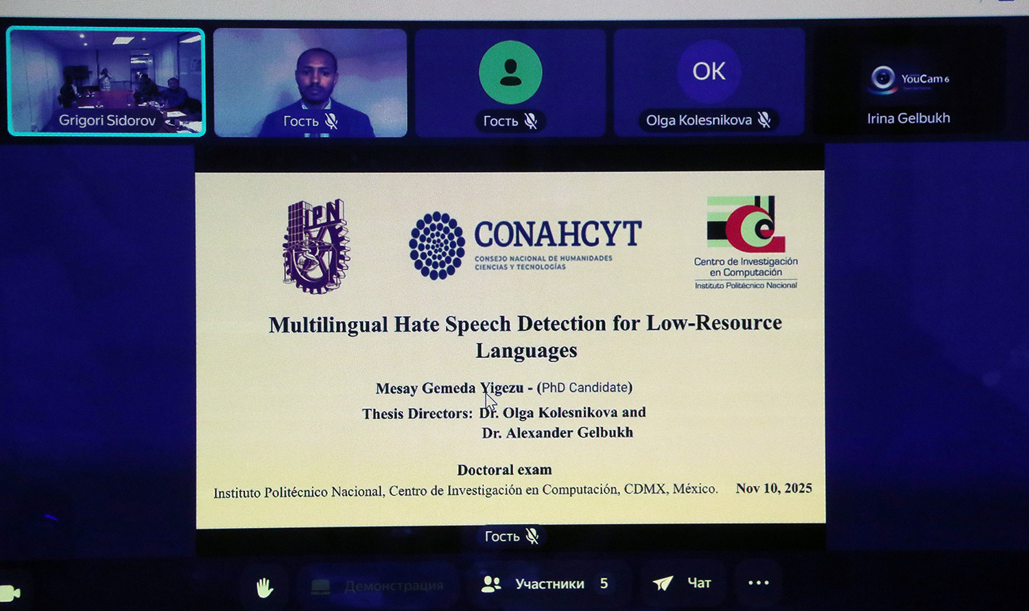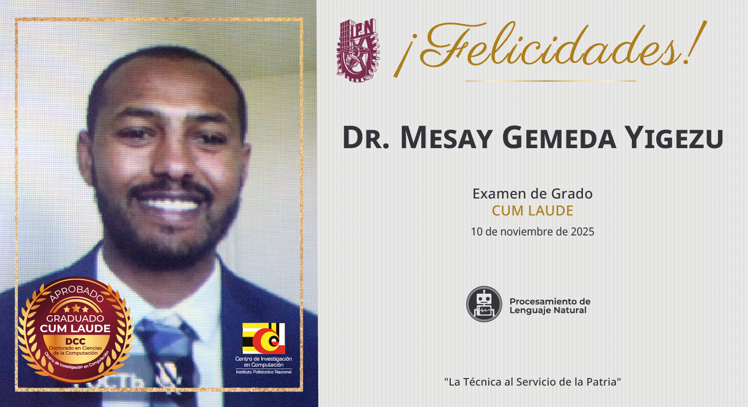 El Centro de Investigación en Computación felicita al felicita al Dr. Mesay Gemeda Yigezu egresado del Doctorado en Ciencias de la Computación del laboratorio de Procesamiento de Lenguaje Natural.